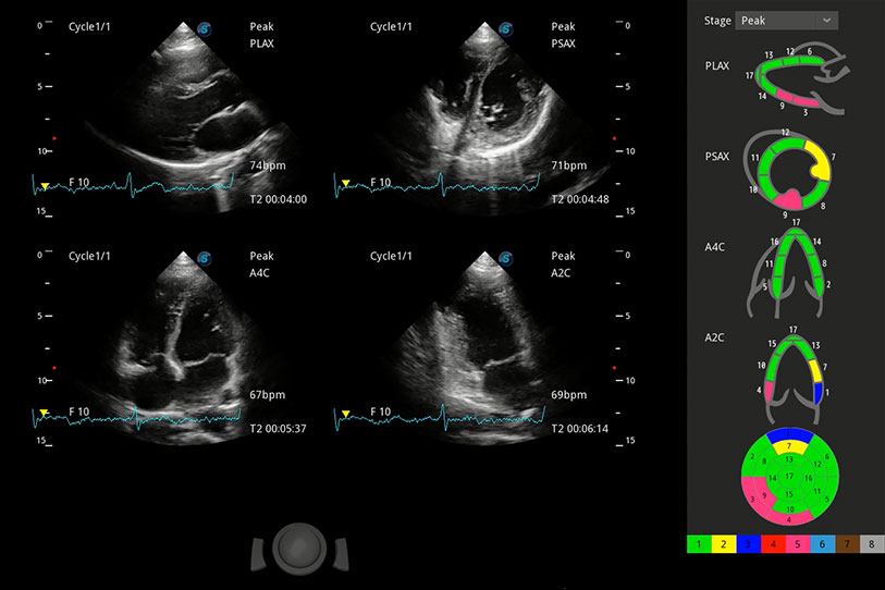 實(shí)時(shí)用顏色表示心肌組織運(yùn)動(dòng),觀察和定量組織的運(yùn)動(dòng)情況,對(duì)快速檢測(cè)與評(píng)估心肌的灌注和活性、電傳導(dǎo)及心肌收縮和舒張功能等均能提供重要的診斷信息。